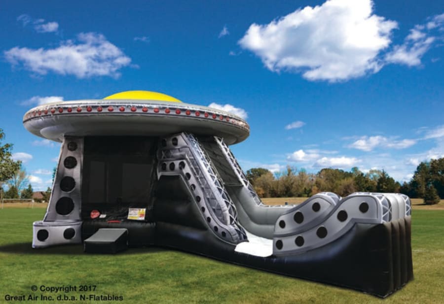 Are you ready for an out of this world experience?? Try our brand-new UFO wet/dry combo. This is massive at 42 feet long, 27 feet wide, and 18 feet tall. Come jump in the outer space!