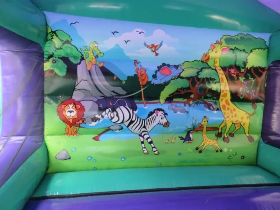 Embark on a wild adventure with our Jungle Bounce and Slide Bouncy Castle! This thrilling inflatable attraction is adorned with vibrant images of a tropical jungle, featuring beloved animals such as lions, zebras, birds, giraffes, elephants, and monkeys in delightful cartoon graphics. Get ready to explore the untamed wonders of the jungle right in your own garden with the Armagh bouncy castle hire experts!