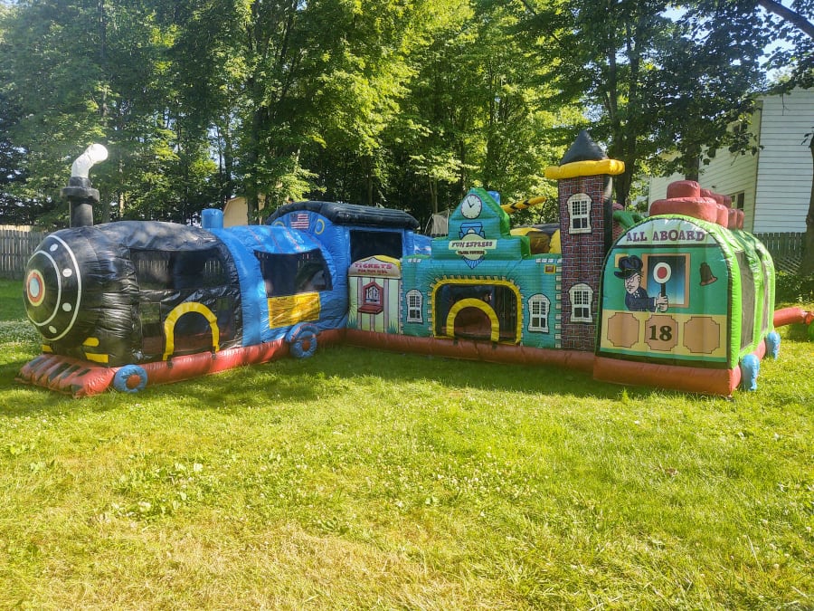 "ALL ABOARD" Punch your ticket for this toddler experience. Crawl through the big blue train and up a slide. The crawl and laugh through silly obstacles. Finish your ride by bouncing around in the little play area! A must have for any tot lot, play zone, or toddler play area! 4 and under only for this bounce, and it comes in a super big size.