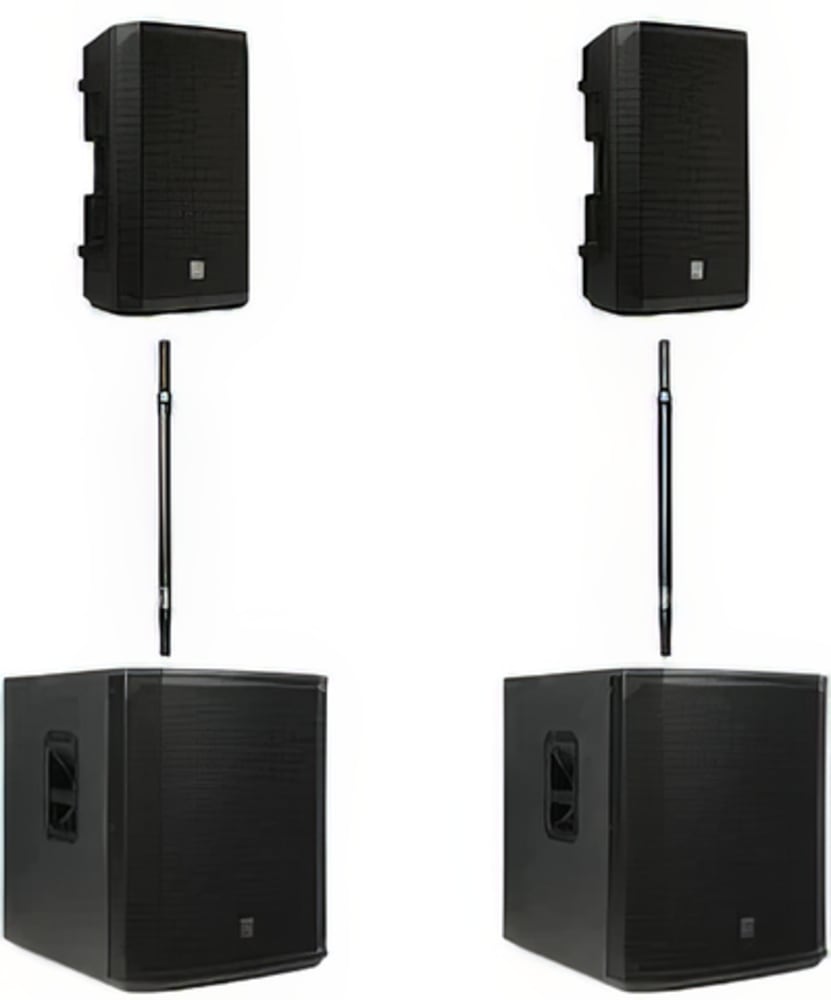 The setup also includes (2) adjustable sub-poles, allowing you to customize the height and positioning for optimal sound distribution. With this complete setup, you'll have the flexibility and power to create an unforgettable audio experience for your audience.