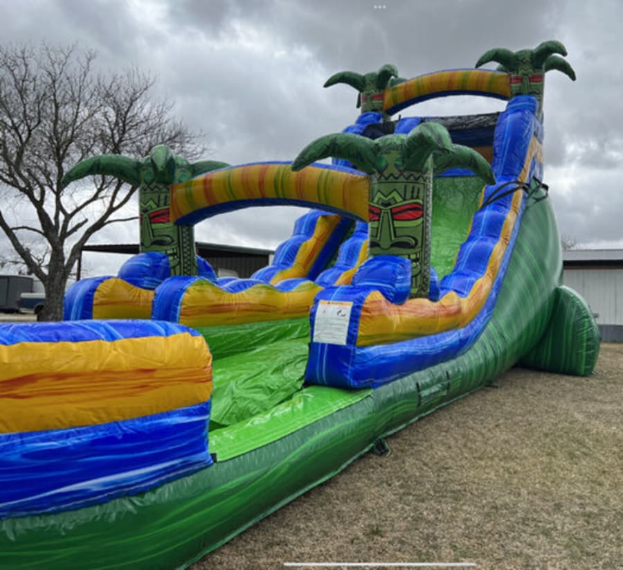 Introducing the Tiki Rush 18ft Waterslide - the ultimate addition to your summer fun! This impressive waterslide stands at 18ft tall and features a vibrant tiki design that will transport you to a tropical paradise.